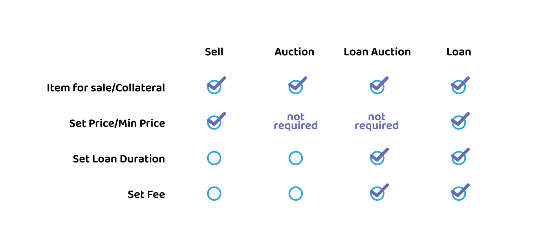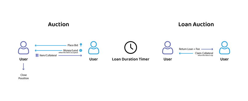 A Loan Auction operates similarly to a Sale Auction, but the result is a loan rather than a sale. Users must specify the collateral, minimum price (optional), loan duration, and fee.