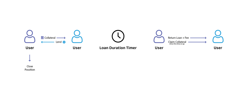 Once the loan position is open, other users can lend the specified amount. If the borrower decides not to go ahead with the loan, they can close the position. After the loan is issued, a timer starts counting down the loan duration. If the loan is not repaid with the fee before the timer runs out, the lender can claim the collateral. However, if the lender has not claimed the collateral after the timer runs out, the borrower can still repay the loan and get their collateral back.