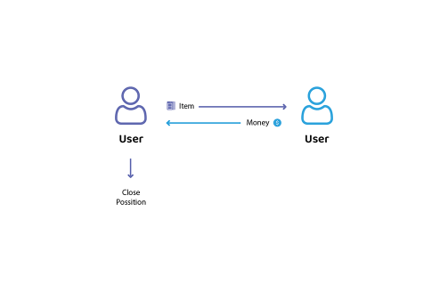 The Sell position allows users to list an item for sale at a specified price. Once the position is opened, it is available for others to purchase. If the seller changes their mind, they have the ability to close the position, provided it has not been sold yet.